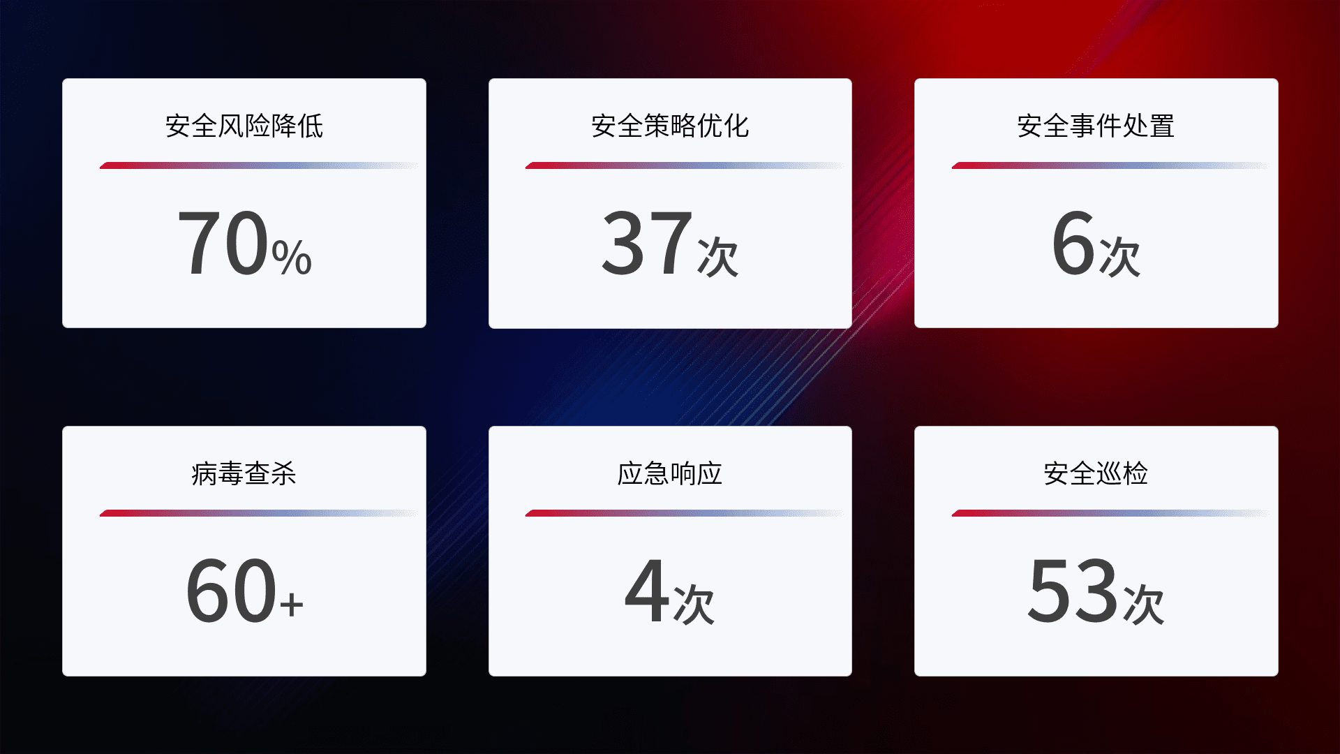 提供全面的安全事件报告体系,,,,包括处置报告、、、周报、、、季度和年度总结,,,结合持续监控,,帮助客户深入了解网络安全状况。。。